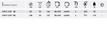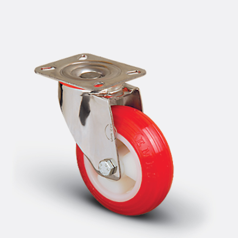 Okretna viljuška od INOX-a. PVC felna obložena crvenim poliuretanom. Točak pogodan za prehrambenu industriju.